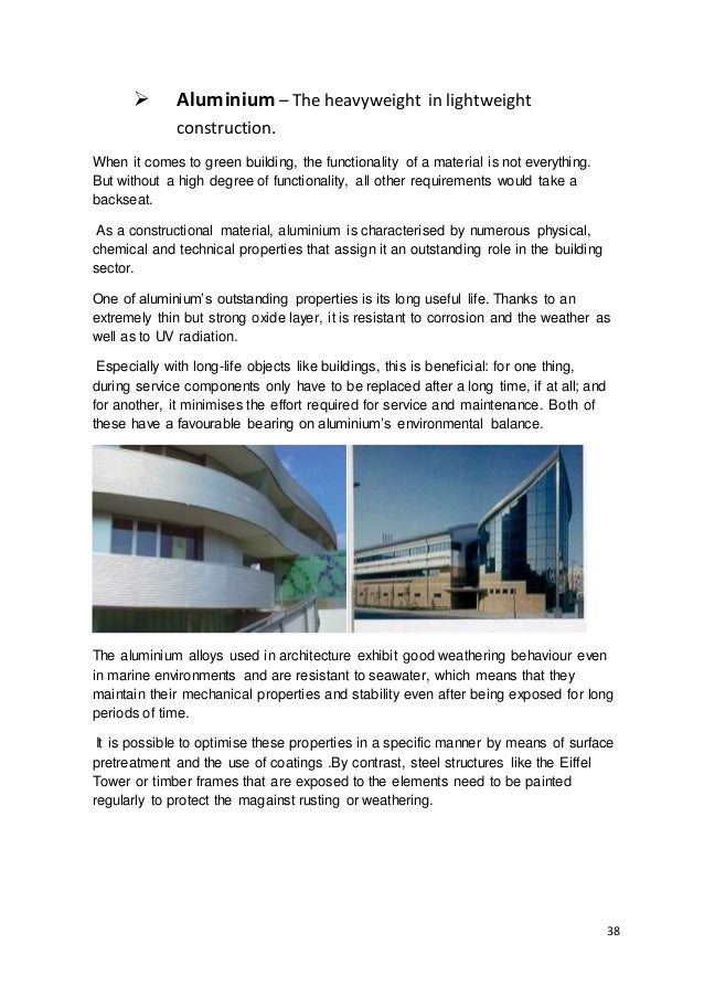 The main market sectors are windows, roofing, cladding, curtain walling and structural glazing, prefabricated buildings, architectural hardware, H&V, shopfitting and partitions. Aluminium is also used extensively in plant, ladders and scaffolding. 11. 11 Primary smelter aluminium is pure and, as such, has a relatively low strength.